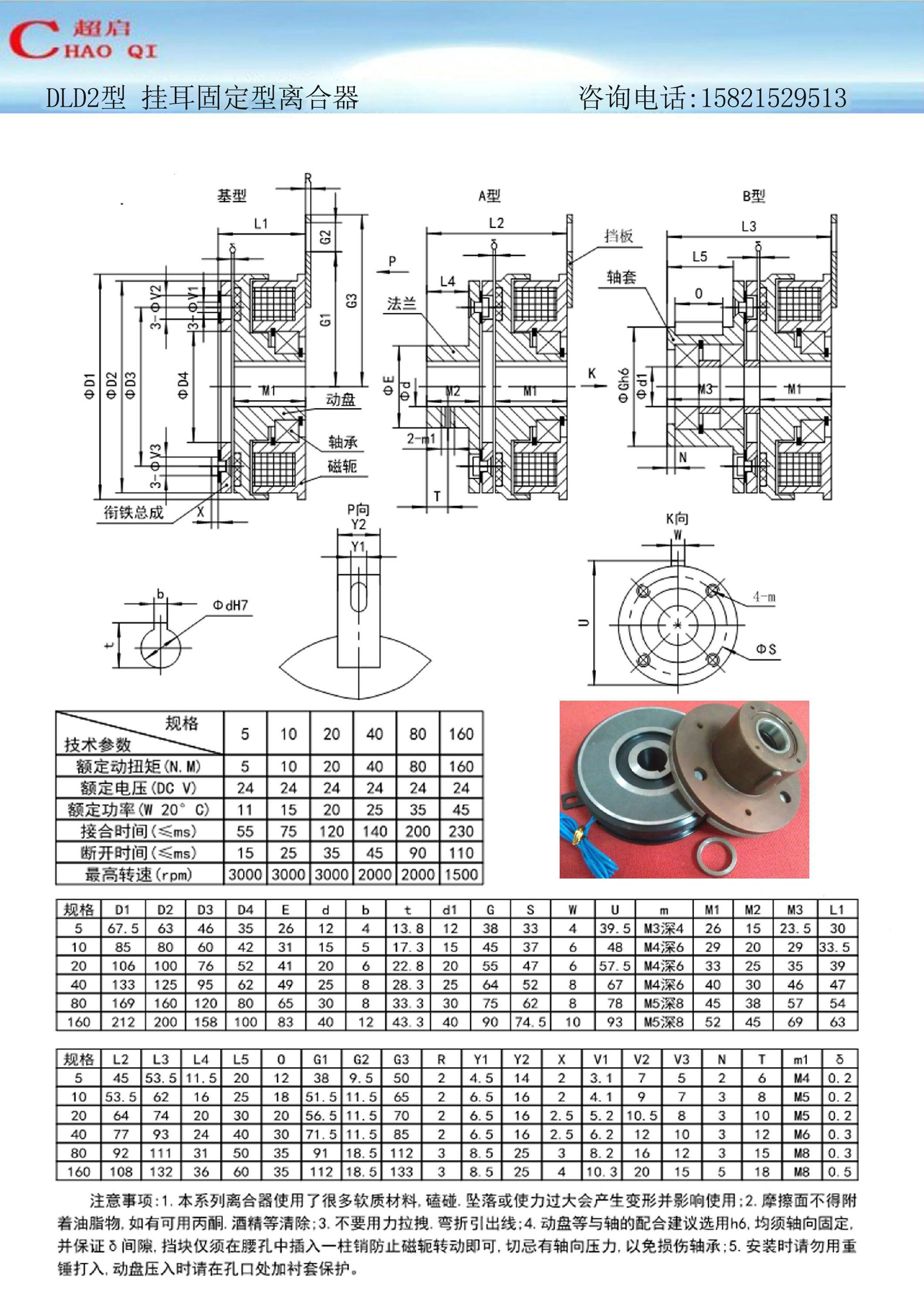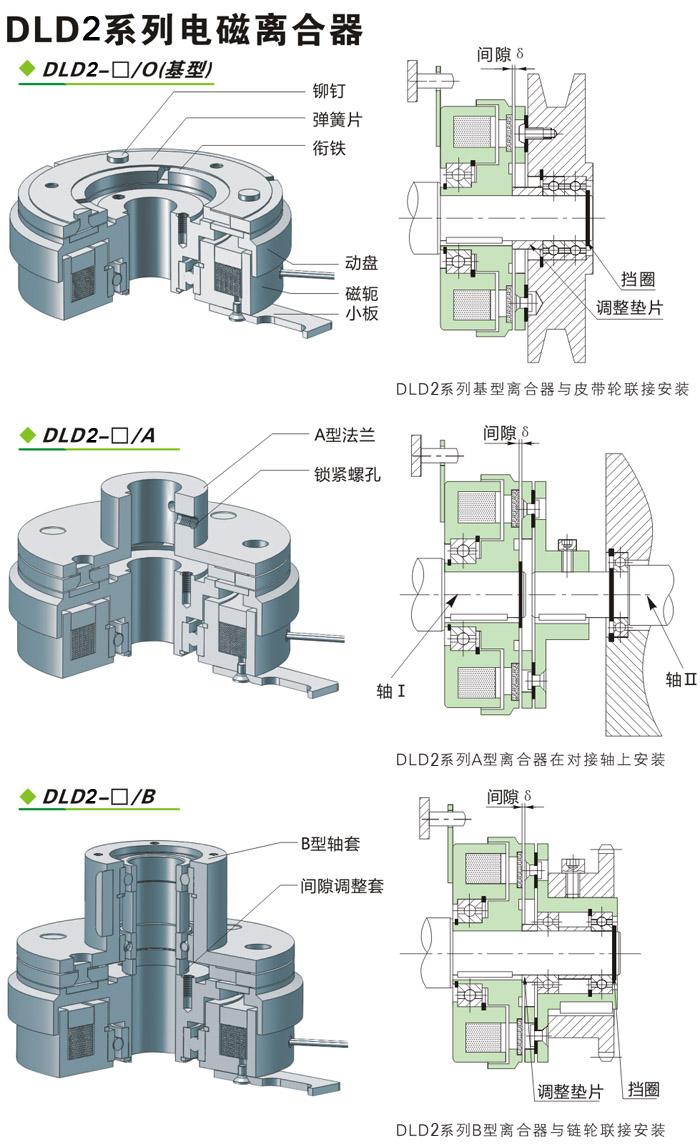 DLD2系列較 DLD1系列增加了動(dòng)盤(pán)與磁軛之間的軸承,已經(jīng)做好動(dòng)盤(pán)的軸向定位, 邊緣1個(gè)掛耳擋板固定線(xiàn)圈盤(pán)即可,用戶(hù)安裝更為簡(jiǎn)單方便。安裝時(shí)要保證磁軛安裝面與軸的垂直度, 動(dòng)盤(pán)及法蘭(A)與軸的配合采用H7/g6,f6, 做好軸向定位,同時(shí)保證圖示摩擦間隙,動(dòng)盤(pán)與磁軛之間的間隙,法蘭(A)的緊頂螺釘在擰入前要涂好防松膠。
